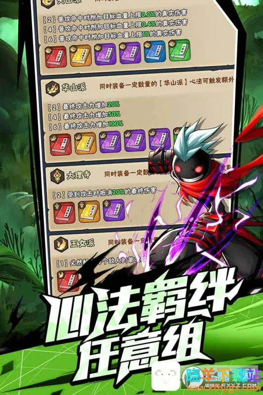 它的秘籍选择丰富,尽显策略性。英雄有专属绝技,打斗快感十足。羁绊搭配多样,比如控制流、输出流、持续战斗流等。心法搭配也很关键,前期昆仑医术搭配可稳定血量,气功闪避属性的心法能在前期增加伤害,后期增强输出的心法很重要,像金刚咒回春决就是很强的存在。操作简单,通过左右按键自动攻击敌人,还能发出不同招式。行进中随机选buff提升自己。双人玩法有趣,可邀请好友一起战斗。快来下载,开启你的火柴人冒险之旅,掌握攻略,称霸火柴人世界!