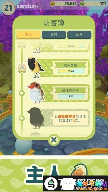 3. 随着民宿评级提升,会有更多性格独特的小鸟飞来入住,可记录它们的足迹。