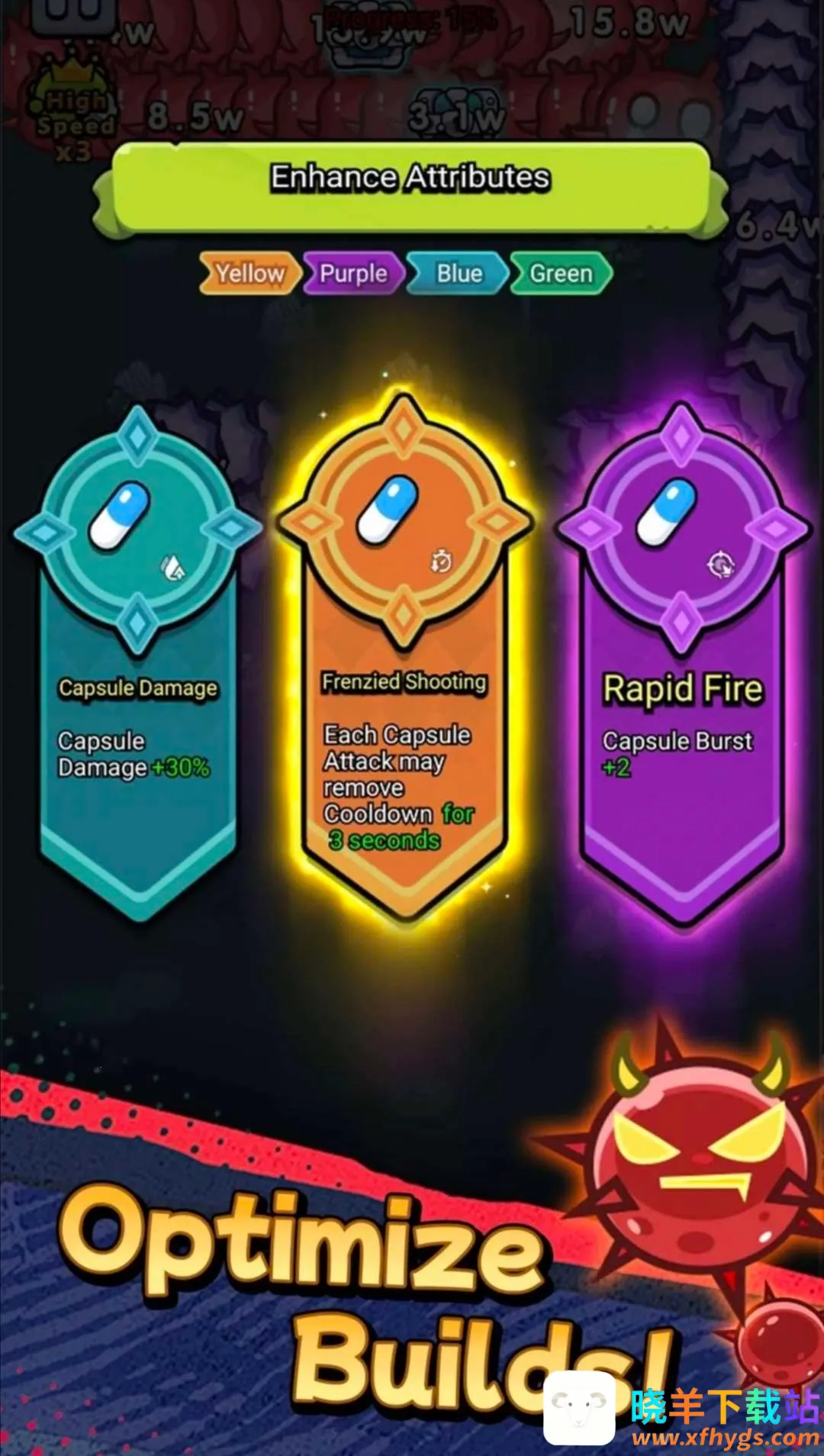 它的玩法丰富,操作简单易上手。进入游戏后,按住角色左右滑动屏幕就能控制移动与射击。战斗中敌人会掉落宝箱,打开可获属性强化机会,系统随机生成三张属性卡供挑选强化,卡片品质越高加成越强。觉得游戏节奏慢,能点击左上角加速按钮调整。成功消灭所有敌人就能完成关卡。空闲时升级武器装备,能提升攻击力与火力输出。
