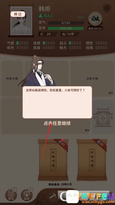 新手玩的话,气感提升修行速度,魅力影响结交同伴成功率,悟性关乎领悟功法品质,经商能在宝典盛会砍价,战斗和体质分别加攻击和生命。开局可看广告选不死体,随机属性多加点经商。按攻略玩,能轻松体验卡包修仙的乐趣,快速提升实力,快来试试吧!