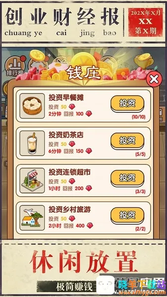 模拟创业最新手机版特色十足。它以底层摆摊为蓝本,让你真切体验从摆摊起步的创业历程,感受白手起家的艰辛与成就,真正体验当老板的乐趣。纯放置玩法超轻松,简化操作,经营过程便捷。随机状况增添趣味,带来新颖完整体验。在这里,从商品把控到员工招聘全由你做主,能亲手打造专属商业帝国。你可招募员工增强实力,看着角色曲折成长,从乞丐晋升为老板。一切从零开始,精心经营,逐步扩张,实现从草根到首富的逆袭,开启独特模拟人生。