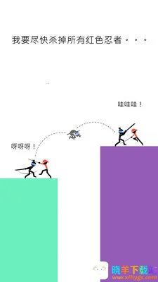 游戏中,玩家要控制忍者主角避开蓝色同伴,斩杀红色忍者。失败情况有三种:撞击或误杀蓝色忍者、未及时出手被红色忍者杀死、无法从红色忍者头顶跳过。