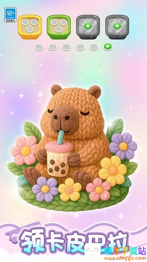 2、可爱的卡皮巴拉正在喝着的珍珠奶茶,周围出现了不同颜色的花朵,需要点击黄色花朵、白色奶茶。
