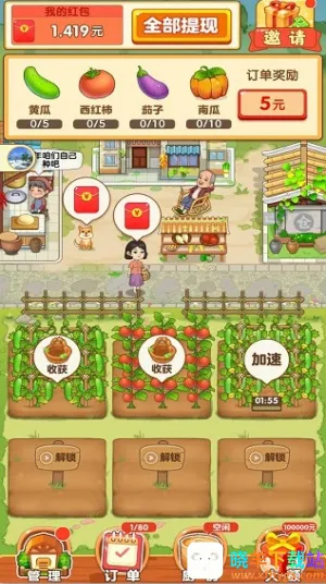 幸福小农院最新手机版特色满满。操作能让你体验平凡农夫生活,悠闲完成挑战。风格多样,乐趣非凡。其卡通画面治愈系,你可购买不同种子种植。通过种植蔬菜、完成订单任务获奖励。培养升级虽耗时,但浇水等操作简单。还有挂机功能,脱机也能取红包。在这里,你能充分享受农家生活模拟的乐趣,感受独特的游戏体验,在轻松氛围中体验种植与收获的喜悦,还能有机会赚取红包,实在是一款不可多得的休闲游戏。
