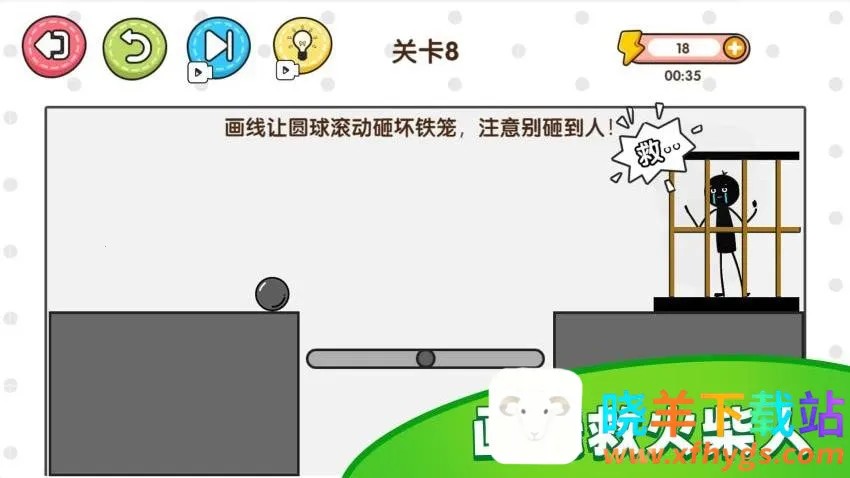 4、让铁球从上方坠落,绘制一条路径,撞开牢笼即可过关。