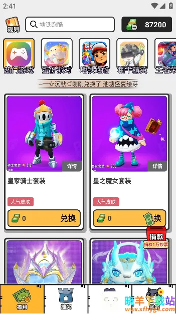 趣领皮肤这类软件能帮你免费领取游戏皮肤。它支持王者荣耀、和平精英等多款热门游戏。通过完成每日任务、签到、参与活动获取积分,就能免费兑换稀有皮肤。比如在趣领皮肤app里,选择想兑换皮肤的游戏,挑好皮肤后点击立即兑换,赚金币就能拿下。它有皮肤兑换系统、任务与活动中心、社区互动模块和安全防护机制。能解决玩家想免费得皮肤的问题,降低经济负担。多游戏支持满足不同玩家需求,实时更新皮肤库,让你能拿到最新皮肤。还支持皮肤预览与自定义搭配。操作简单,针对小白人群有详细教程。注重安全隐私保护,用AES-256加密技术保障账号安全。每天发布新任务,收集皮肤轻松便捷,能让你轻松享受游戏,增添乐趣,掌握游戏最新资讯,是游戏玩家的福利好帮手。