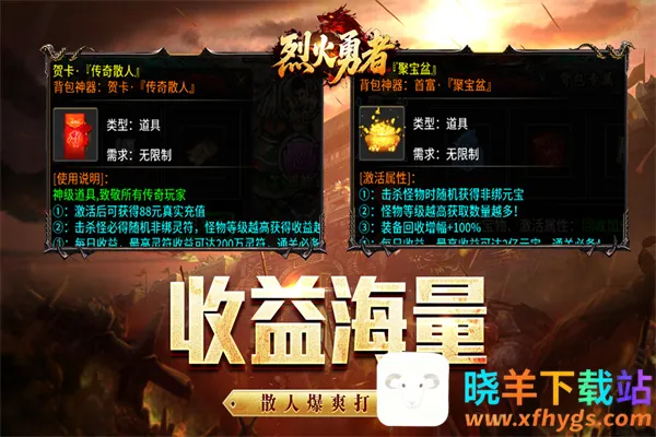 烈火勇者是一款经典复古传奇RPG游戏。玩家能体验紧张刺激战斗,通过任务和挑战熟悉机制、掌握技巧、提升实力。其万物皆可爆的设定,让打怪掉落几乎所有武器装备,前期也有机会得顶级神器,激发玩家探索欲望。账本自由交易,形成供需市场,增加互动性与趣味性。玩家可通过低级装备合成高级装备。新手大礼包助新手快速上手提升战力,完成主线任务开启更多提升途径并体验丰富剧情,打强大boss能获丰厚掉落。转生可提升属性进入高级地图获取更强装备,神器体系让所有怪物都可能掉落装备,且无无脑消费模式,游戏更人性化,玩家能享受更多乐趣。