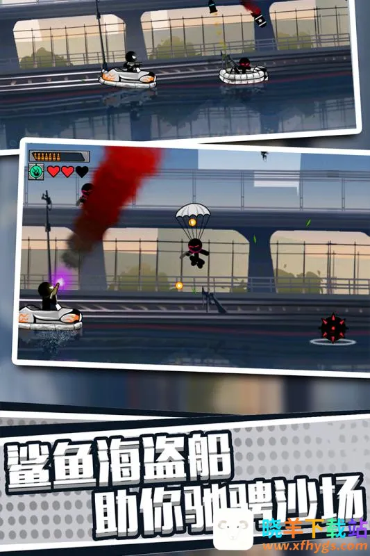 火柴人英雄刺激冒险2026官方正版特色十足。水陆空三方作战机制超震撼,敌人从地面、空中、水域同步追击,带来立体压迫感,让击杀更有成就感,场景代入感飙升。武器空投补给系统很实用,战场随机投放空投,含多样武器,需躲避攻击精准拾取,依场地选趁手武器助力战斗。跨场景载具体系超酷炫,解锁鲨鱼、海盗船、跑车等载具,覆盖水陆空战场,可快速转移或冲撞敌人,搭配武器降低战斗难度,拓展战术维度,给你前所未有的刺激冒险体验。