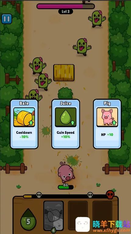 想体验农场防御所有关卡通关的乐趣吗?这款快节奏塔防游戏绝对能满足你!在游戏里,你将化身勇敢的小猪,守护农场抵御一波又一波强大且危险的僵尸。每关结束后,有新战斗技能、被动技能强化、特殊农场物品三种升级可选,独特的农场工具能助你控制战场,比如投掷干草捆减缓敌人速度、用马蹄铁猛击造成大量伤害、用镰刀砍杀附近敌人,不同选择塑造不同游戏风格。它有着经典塔防玩法并融合动作元素,僵尸波次难度递增,随机升级系统带来高重玩价值,操作简单,节奏快速,还有轻松幽默的农场主题。无论你喜欢输出、防御还是群体控制,都能在这找到乐趣,快来试试,看看能否成功守住防线,阻止僵尸入侵,通关所有关卡,保卫农场吧!