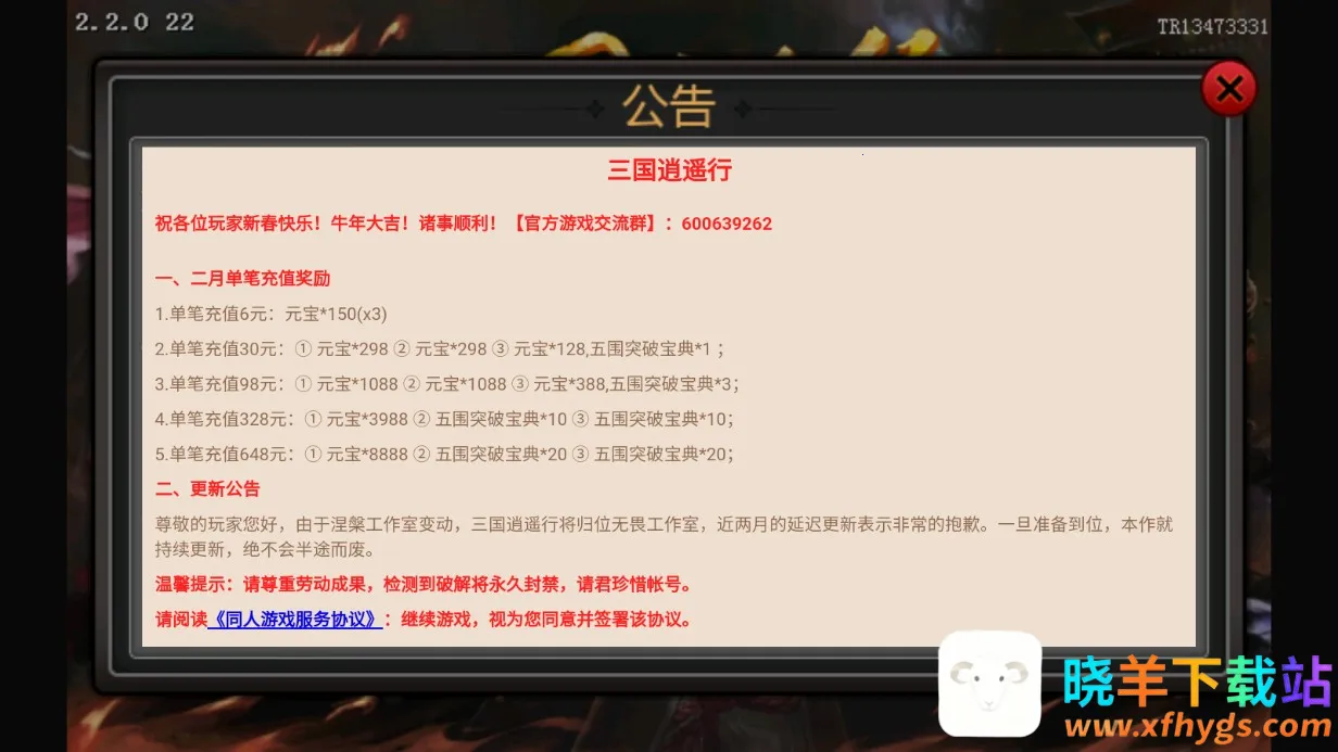 《三国逍遥行》是一款超有趣的单机策略战棋RPG游戏。在游戏里,你将跟随现代青年张强穿越到东汉末年,体验独特的三国冒险。它有着纯正的战棋玩法,步骑弓谋兵种相克,地形高低影响攻防,每场战斗都是智谋对决,考验你的指挥艺术。还有丰富的装备系统,方天画戟、青龙偃月刀等传奇宝物散落乱世,每件装备都有独特特效,能配合武将特性打造专属战术体系。游戏采用多线叙事,你的每个选择都会深刻影响游戏发展,可辅佐明主,也能自立为王,有红线、蓝线及隐藏线等不同剧情走向等你来探索。而且它是纯净单机,无氪无内购,没有VIP系统和广告打扰。在这里,你既能感受历史的激荡,又能看到现代幽默与社畜视角的巧妙融合,从底层小卒开始,一步步书写自己的三国传奇,快来开启属于你的逍遥之旅吧!