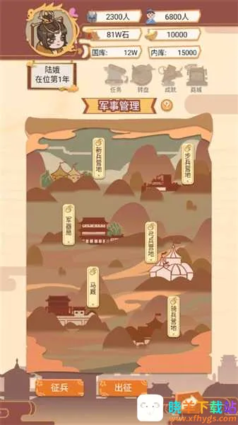 3、军事管理:升级四大兵种营地(步、骑、弓、工),增强征兵容量与部队战力,还可亲自率军出征平定叛乱或开疆拓土;
