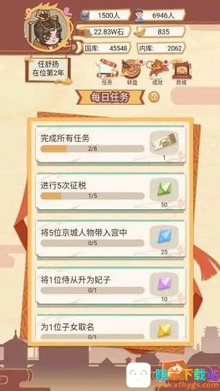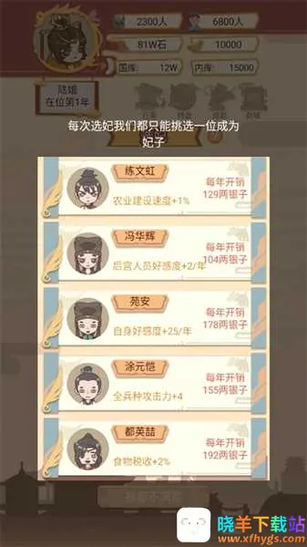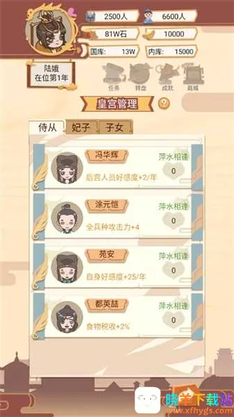 4、皇宫管理:统筹后宫人员编制与俸禄发放,侍从好感度满值后可晋升为妃子,属性加成翻倍,但年度开支同步大幅上升。
